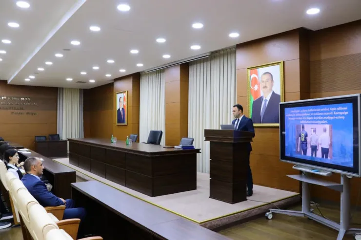 Lent.az xəbər verir ki, Baş Prokurorluğun Cinayət təqibindən kənar icraatlar idarəsinin rəisi Elnur Musayev ölkədə korrupsiyaya qarşı mübarizə sahəsində həyata keçirilən kompleks hüquqi və institusional tədbirlər, o cümlədən korrupsiya cinayətlərinin qarşısının alınması, profilaktik və maarifləndirici fəaliyyətlərin təşkili, ictimai nəzarət mexanizmlərinin tətbiqi, vətəndaşların hüquqi şüurunun artırılması istiqamətində görülən işlər barədə tələbələrə ətraflı məlumat verib.