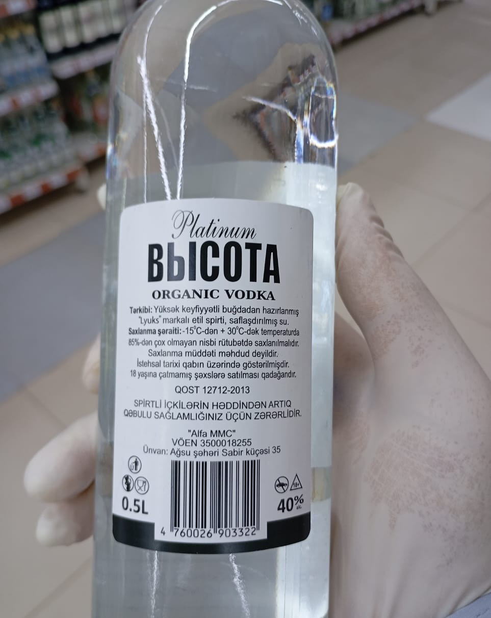 AQTA-dan Lent.az-a verilən xəbərə görə, baxış zamanı iaşə obyektində 8 ədəd 1 litrlik, 3 ədəd 0.7 litrlik və 8 ədəd 0.5 litrlik “Platinum Vısota” əmtəə nişanlı saxta spirtli içki aşkarlanıb. Məhsullardan nümunələr götürülərək laborator müayinələrə cəlb olunub.