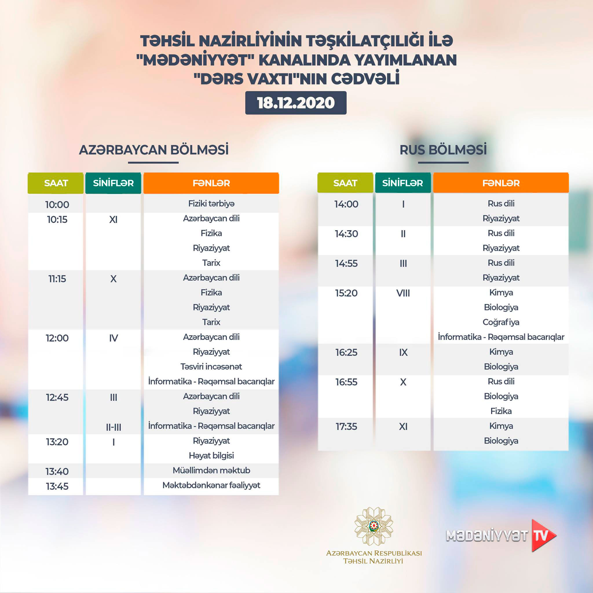 "Dərs vaxtı"nın bugünkü CƏDVƏLİ