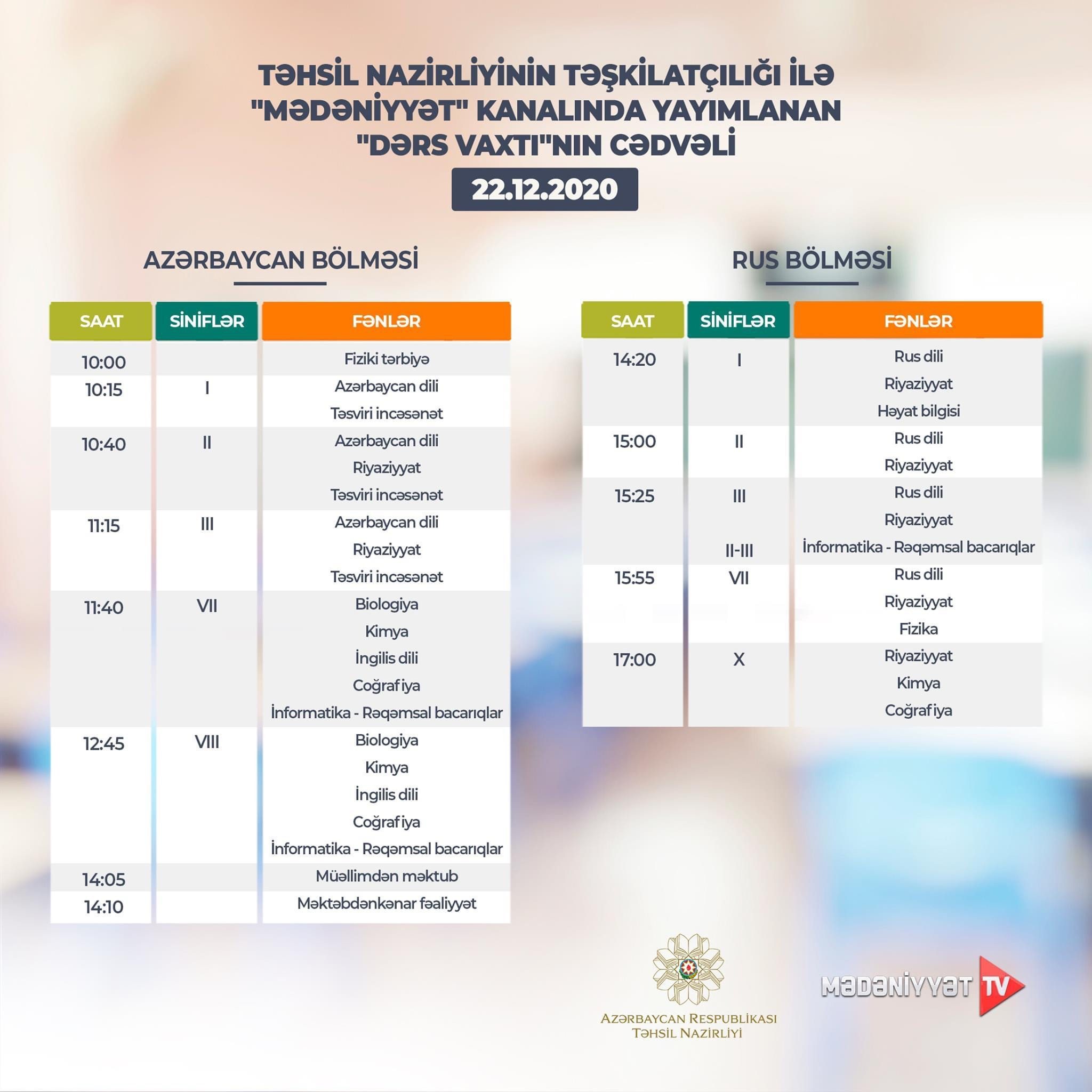 Təhsil Nazirliyi dərs cədvəlinə diqqət etməyi, dərsi “Dərs vaxtı”nda öyrənməyi tövsiyə edir.
