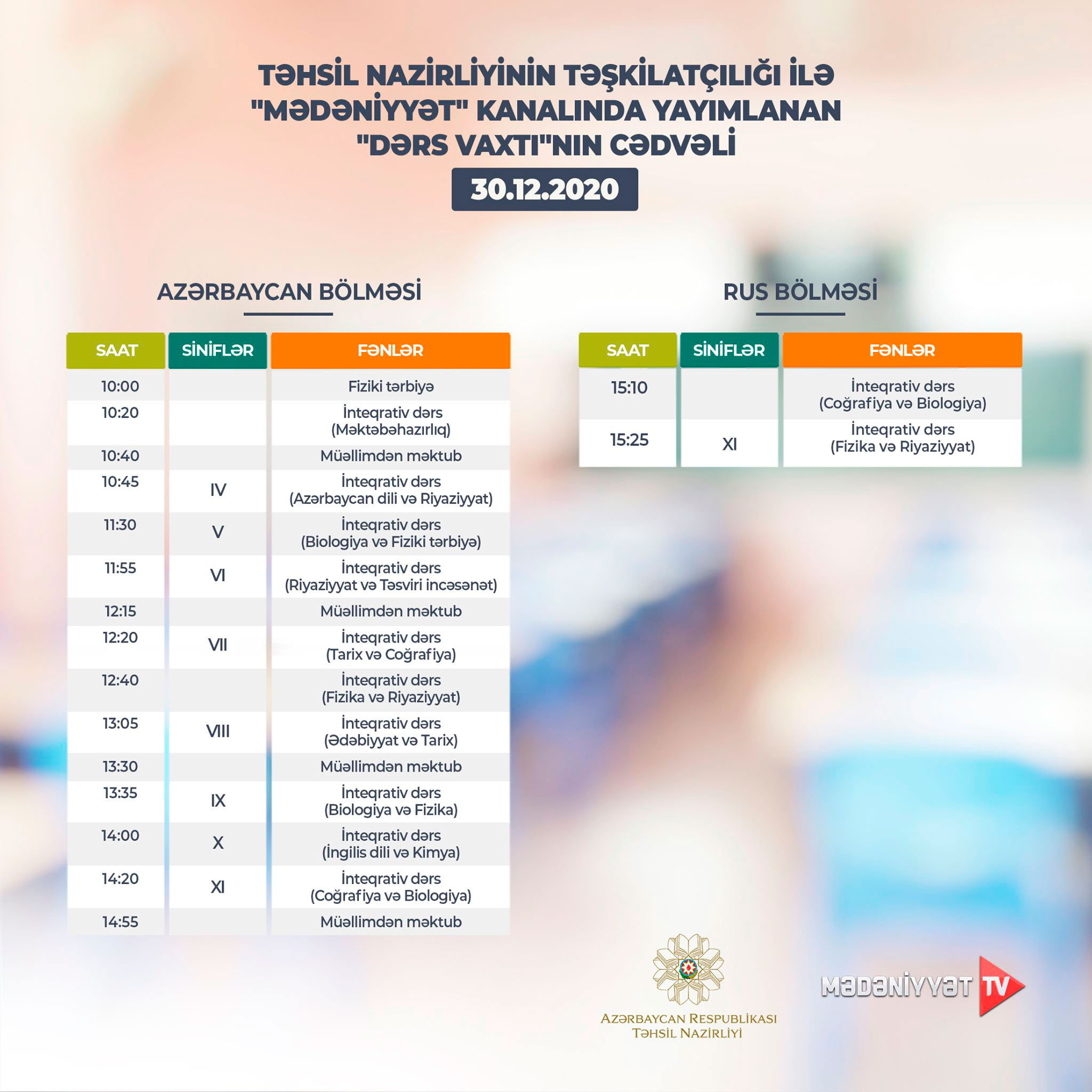 "Dərs vaxtı"nın bugünkü CƏDVƏLİ