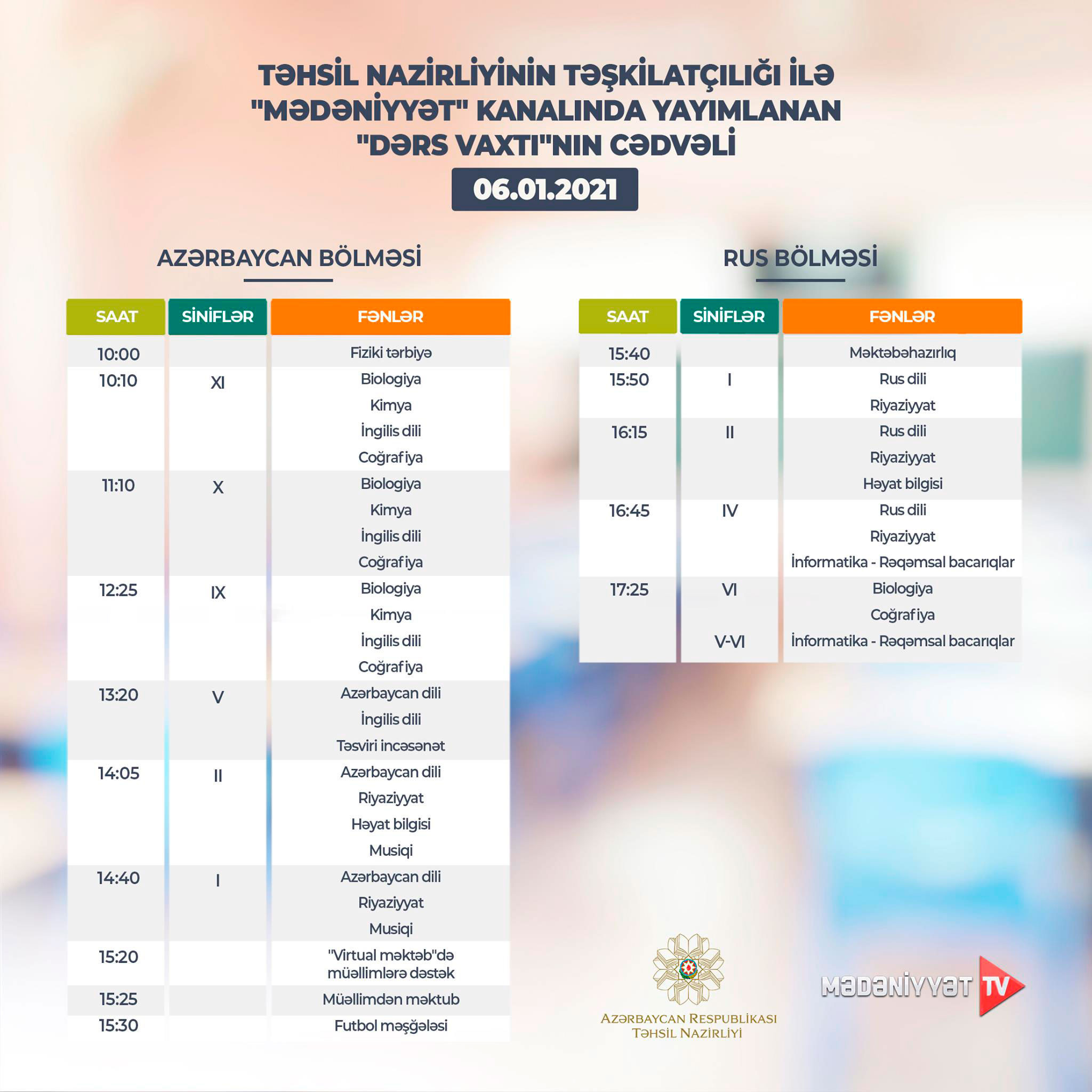 "Mədəniyyət" və "ARB Günəş" telekanallarında yayımlanan “Dərs vaxtı” proqramının bu günə olan cədvəli açıqlanıb.