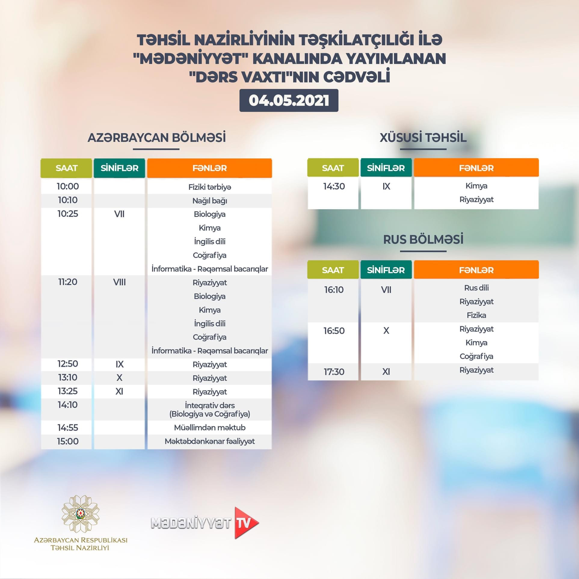Təhsil Nazirliyi dərs cədvəlinə diqqət etməyi, dərsi “Dərs vaxtı”nda öyrənməyi tövsiyə edir.