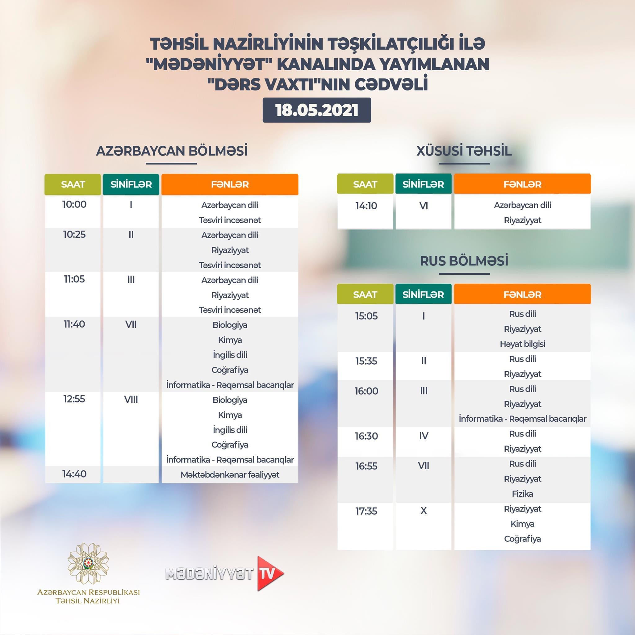 "Mədəniyyət" və "ARB Günəş" telekanallarında yayımlanan “Dərs vaxtı” proqramının bu günə olan cədvəli açıqlanıb.