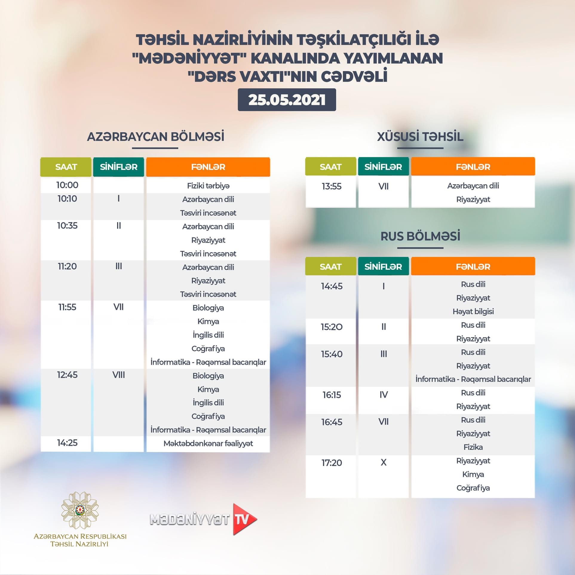 Təhsil Nazirliyi dərs cədvəlinə diqqət etməyi, dərsi “Dərs vaxtı”nda öyrənməyi tövsiyə edir.