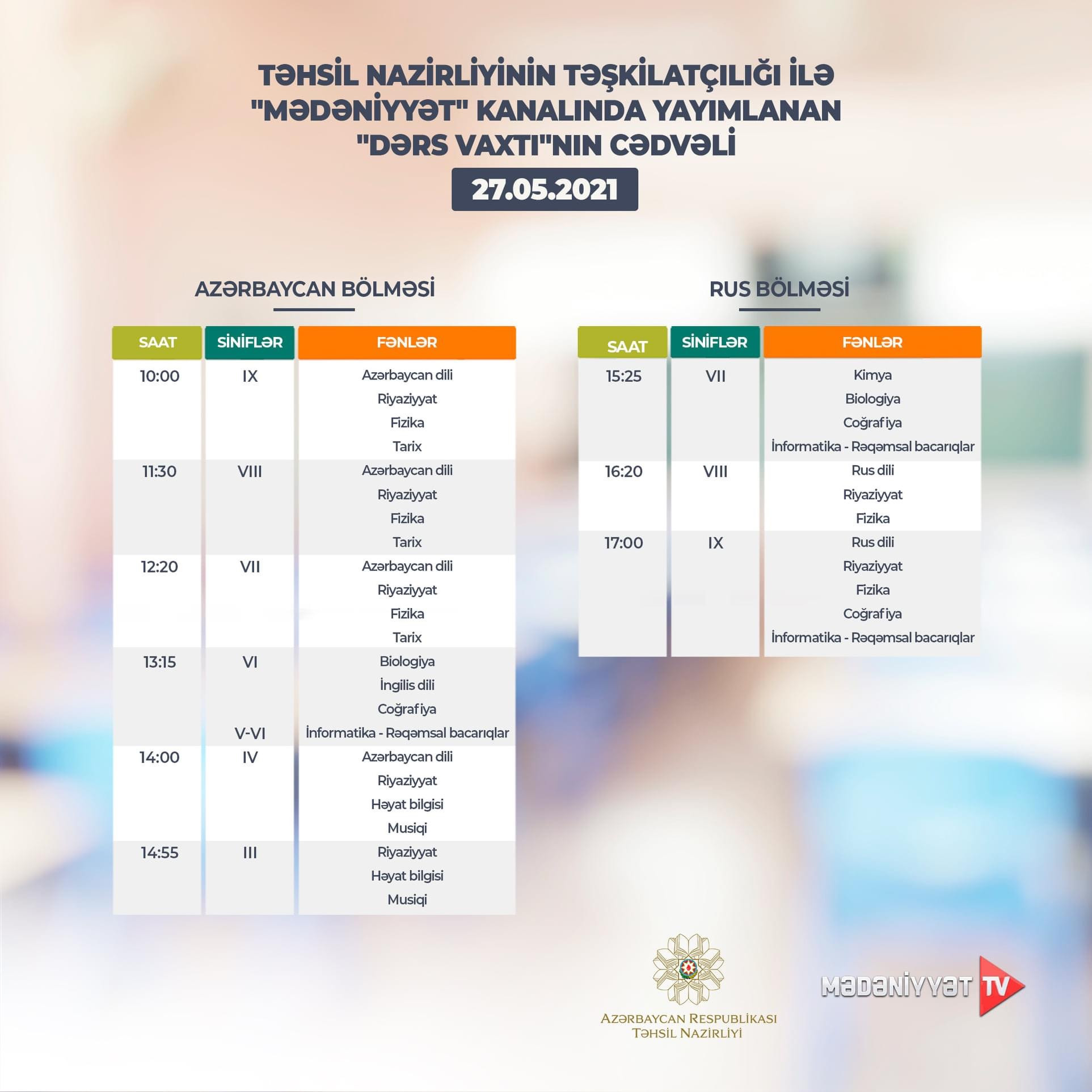 "Mədəniyyət" və "ARB Günəş" telekanallarında yayımlanan “Dərs vaxtı” proqramının bu günə olan cədvəli açıqlanıb.