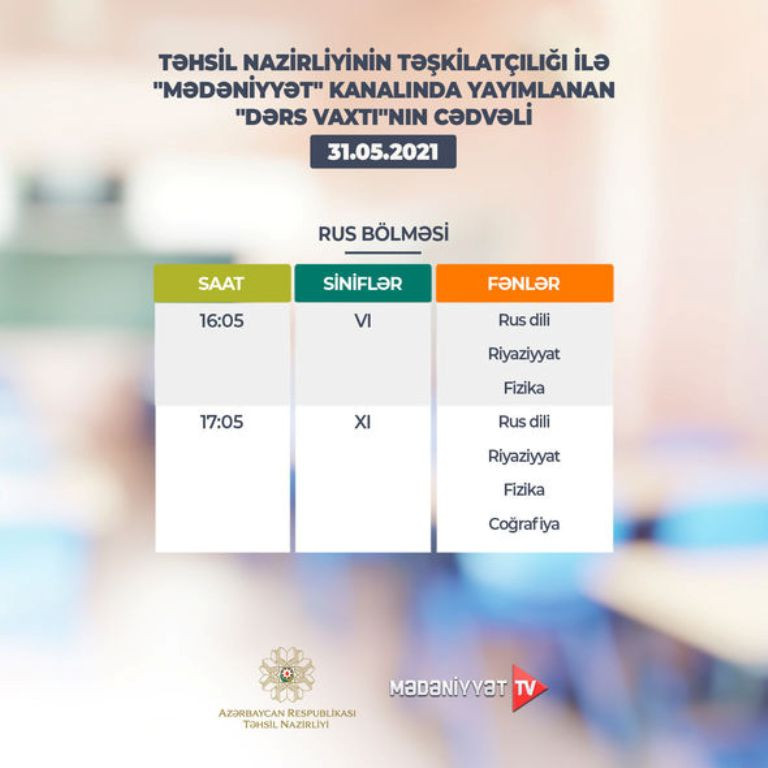 Təhsil Nazirliyi dərs cədvəlinə diqqət etməyi, dərsi “Dərs vaxtı”nda öyrənməyi tövsiyə edir.