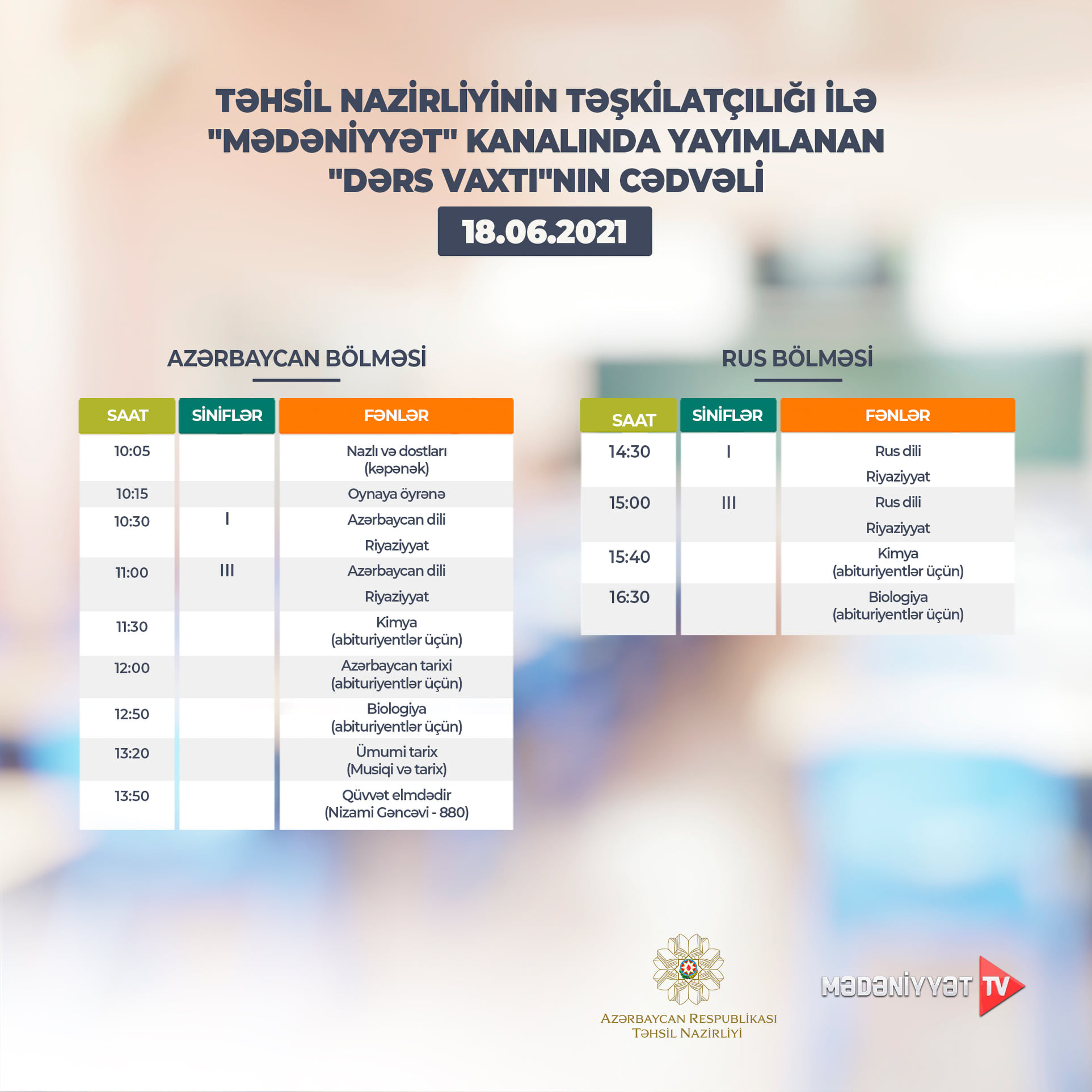 "Mədəniyyət" və "ARB Günəş" telekanallarında yayımlanan “Dərs vaxtı” proqramının bu günə olan cədvəli açıqlanıb.