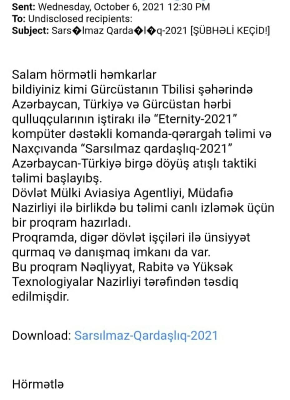 Nazirlikdən Lent.az-a verilən məlumata görə, vətəndaşlara elektron poçt üzərindən göndərilən saxta məktublarda guya Azərbaycan, Türkiyə və Gürcüstan hərbi qulluqçularının iştirakı ilə müxtəlif hərbi təlimlərin keçirildiyi bildirilir. Qeyd olunur ki, həmin təlimləri canlı izləmək üçün Dövlət Mülki Aviasiya Agentliyi Müdafiə Nazirliyi ilə birlikdə “Sarsılmaz qardaşlıq – 2021” proqramını hazırlayıb. Saxta məktubda həmin proqramın Nəqliyyat, Rabitə və Yüksək Texnologiyalar Nazirliyi tərəfindən təsdiq edildiyi vurğulanır.