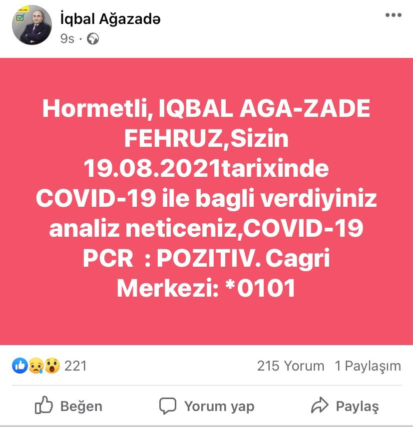 İ.Ağazadə qeyd edib ki, avqustun 19-da analiz verib və nəticə pozitiv olub.