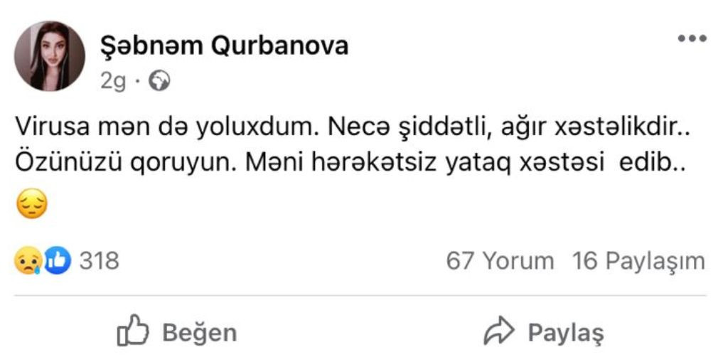 Lent.az xəbər verir ki, ingilis dili müəllimi olan Şəbnəm Qurbanova bir neçə gün əvvəl koronavirusa yoluxması barədə paylaşım edib: