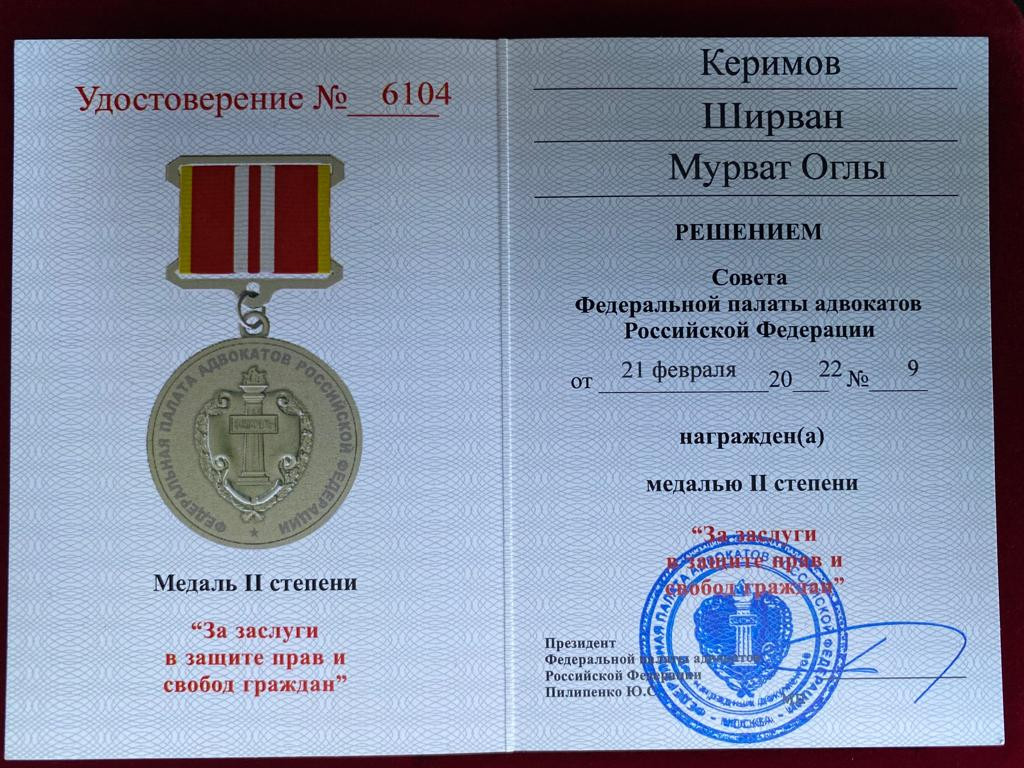 Rusiyada Azərbaycan diasporunun liderlərindən olan Şirvan Kərimov mükafata layiq görülüb. Lent.az-ın məlumatına görə, o, Rusiya Federasiyası Vəkillər Palatasının “Vətəndaşların hüquq və azadlıqlarının müdafiəsində xidmətlərinə görə” medalıyla təltif edilib.