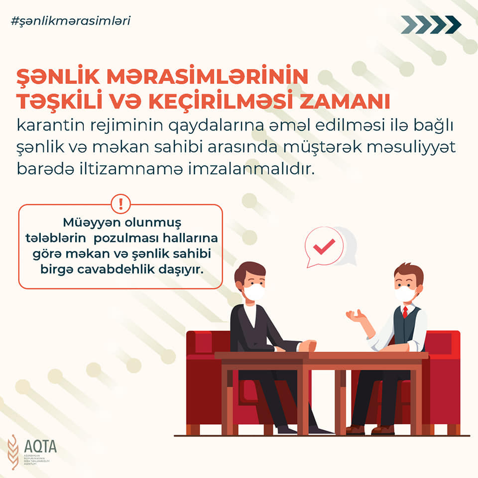 Qaydalara əsasən, şənlik mərasimlərində xidmət göstərən heyətin (musiqiçilər istisna olmaqla) tibbi maska, əlcək və digər fərdi qoruyucu vasitələrdən istifadəsi məcburidir və sahibkarlar tərəfindən bu tələbin icrasına nəzarət edilməlidir. İctimai iaşə müəssisəsində karantin rejiminin tələblərinə riayət olunması üzrə əlaqələndirici məsul şəxs təyin edilməli, obyektlərinin giriş-çıxışlarında, masalarda, kassalarda, sanitar qovşaqlarda dezinfeksiya məhlulundan istifadə imkanı, o cümlədən dezinfeksiya məhlulundan istifadə üçün müvafiq qurğular (dispenserlər) yerləşdirilməli və həmin qurğular işlək vəziyyətdə olmalıdır. Qida qəbulu zallarında, otaqlarda, habelə açıq hava sahələrində oturacaqların ara məsafəsinin eyni masa arxasında 1 metrdən, masalararası məsafələr isə 2 metrdən az olmamalıdır. Bununla yanaşı, koronavirus (COVID-19) pandemiyası dövründə restoranlar üçün adambaşına 100 nəfərə qədər 5.08 m², 100 nəfərdən sonrakı hər adam üçün əlavə 4.4 m² tələbinin yerinə yetirilməsi zəruri şərtlərdəndir. Şənlik mərasimi keçirilən məkanın və ya müəssisənin sahibi həmin obyekt daxilində fəaliyyət göstərən tədbir zalları, onların tutumu və çalışan işçi heyət (müvəqqəti işə cəlb edilmiş işçilər daxil olmaqla) barədə, habelə şənlik mərasiminin keçirilməsi tarixinə ən azı 5 (beş) gün qalmış mərasimin keçirilmə tarixi, başlama və bitmə vaxtı (saat 00:00-dan gec olmamaqla), qonaq sayı haqqında məlumatları “icaze.e-gov.az” portalına daxil etməlidir. Portala daxil edilmiş bu məlumatlara dair çıxarış monitorinqə gələn agentliyin müfəttişlərinə təqdim edilməlidir.