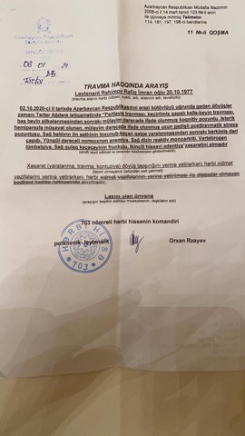 Tuşlayıcı əsgər də başından yüngül qəlpə yarası aldı. Mən sağ dizimdən aşağı qəlpə yarası aldım və sol tərəfim hemiparez (insult kimi) oldu. Hazırda həmin vəziyyətdəyəm. Sol ayağımı hiss etmirəm. Amma həkimlərin dediklərinə görə, səbirli olmalıyam. Müəyyən zaman ərzində səhhətimdə hər şey yaxşı olacaq. Yeriməyimin nə cür olacağını deyə bilmirlər. Sağ beynimin damarları quruyub. Ayağıma siqnal vermir. Nitqimdə qüsur yarandı, bir az danışandan sonra...
