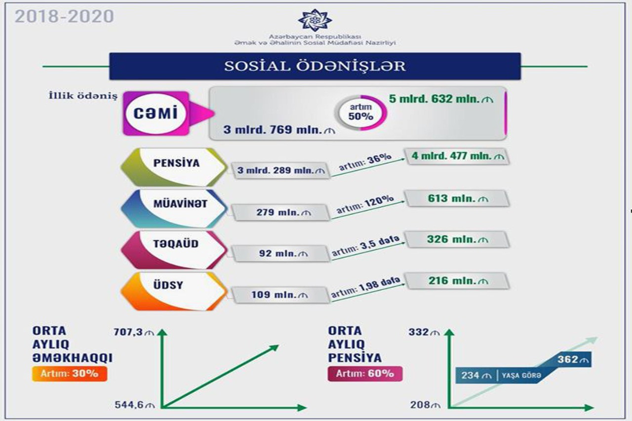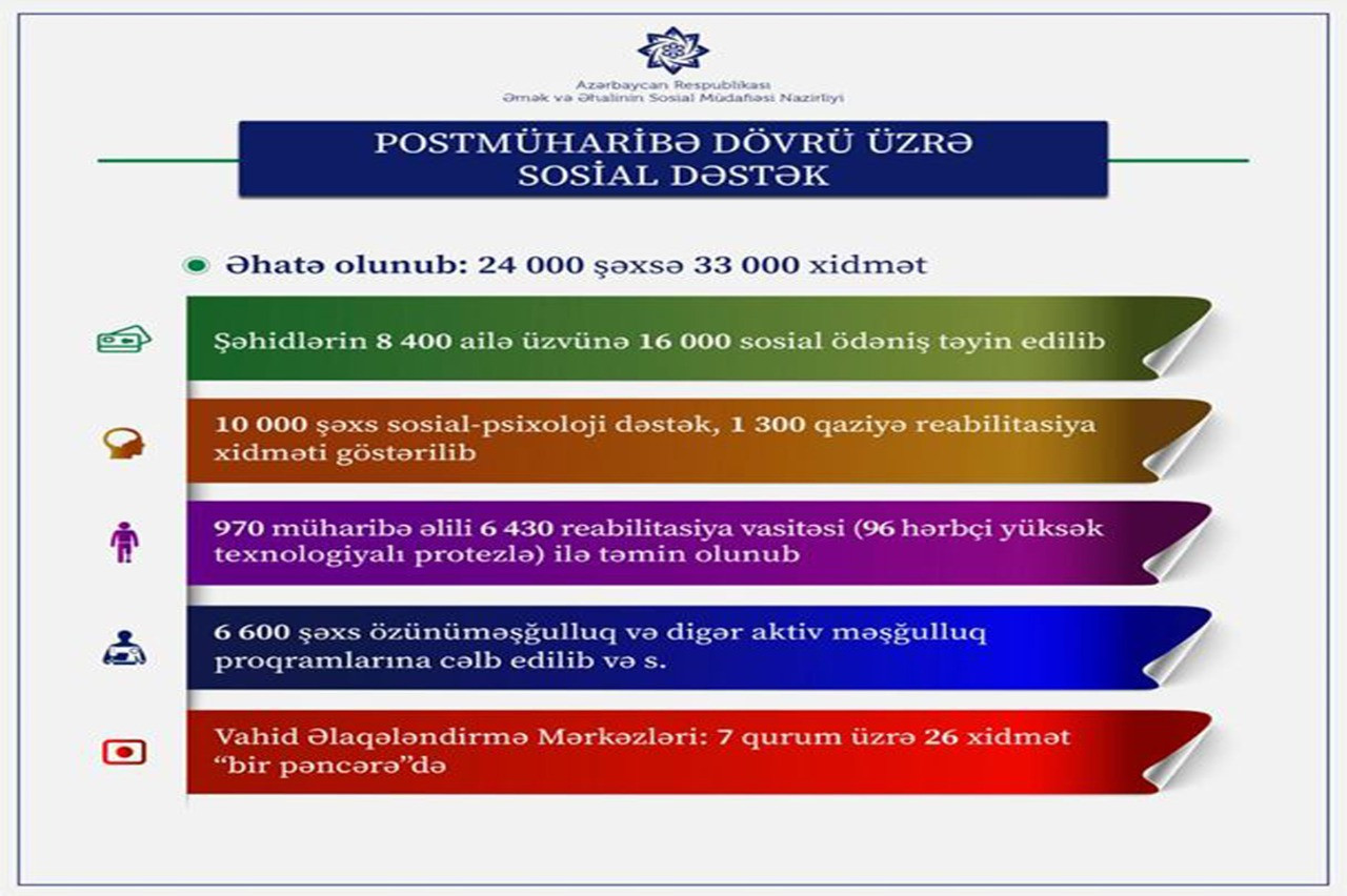 Şəhid ailələrinin üzvləri və müharibə veteranlarının aktiv məşğulluq tədbirləri çərçivəsində son 6 ayda 47 min 400 nəfər işlə təmin olunub, 7 min nəfər özünüməşğulluq proqramına, 56 min nəfər isə ictimai işlərə cəlb olunub. 2018-2020-ci illərdə bu qəbildən olan vətəndaşların orta aylıq əməkhaqqı 30 faiz, orta aylıq pensiyası isə 60 faiz artıb. Postmüharibə dövründə 24 min şəxsə 33 min xidmət göstərilib. Şəhid ailələri və xəsarət alan hərbçilərlə bağlı Prezident İlham Əliyevin bu ilin iyun ayında imzaladığı Fərmanla yaradılan Vahid Əlaqələndirmə Mərkəzində 7 qurum üzrə 26 xidmət göstəriləcək. Yaxın iki ay ərzində bu cür mərkəzlər DOST mərkəzlərində fəaliyyətə başlayacaq.