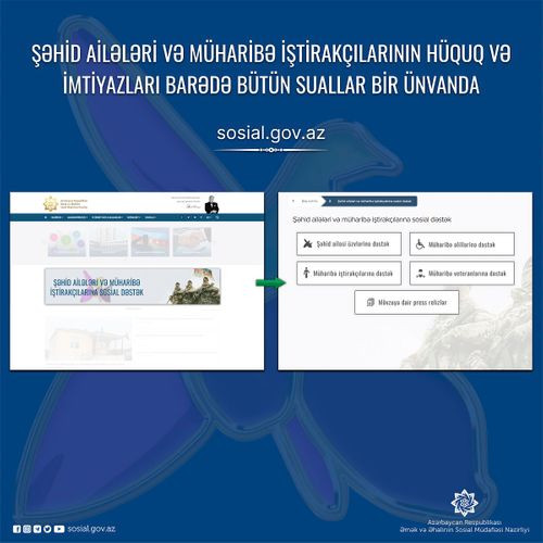 Əmək və Əhalinin Sosial müdafiəsi Nazirliyindən Lent.az-a verilən xəbərə görə, bununla əlaqədar məlumatlılıq səviyyəsinin artırılması, xüsusilə həmin kateqoriyalardan olan vətəndaşların daha rahat şəkildə dolğun məlumatlara malik olmaları üçün nazirliyin rəsmi internet saytında (sosial.gov.az) “Şəhid ailələri və müharibə iştirakçılarına sosial dəstək” adlı yeni bölmə yaradılıb.