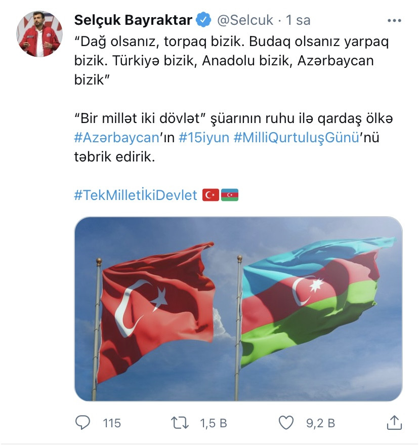 Türkiyənin “Baykar Makine” şirkətinin texniki direktoru Selçuk Bayraktar Azərbaycanın Milli Qurtuluş Günü münasibəti ilə paylaşım edib.