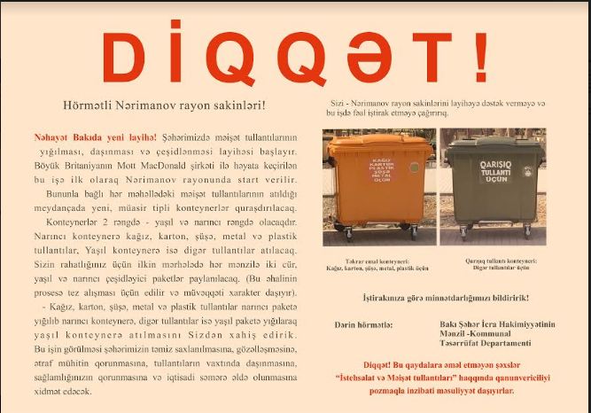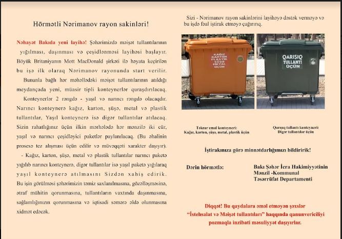 Quraşdırılan konteynerlər 2 rəngdə - yaşıl və narıncı rəngdə olacaq. Narıncı konteynerə kağız, karton, şüşə, metal və plastik tullantılar, yaşıl konteynerə isə digər tullantılar atılacaq. Sakinlərin rahatlığı üçün ilkin mərhələdə hər mənzilə 2 cür yaşıl və narıncı çeşidləyici paketlər paylanacaq.