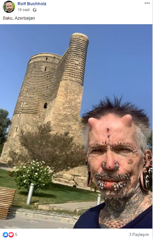 Bakıda dolaşan almaniyalı turist Rolf Buchholz görənlərin diqqətini çəkib. Diqqət çəkən məqam isə 60 yaşlı turistin üzündə olan qeyri-adilikdir. Rolf Buchholz oktyabrın 3-də Aşqabaddan Bakıya gəlib.