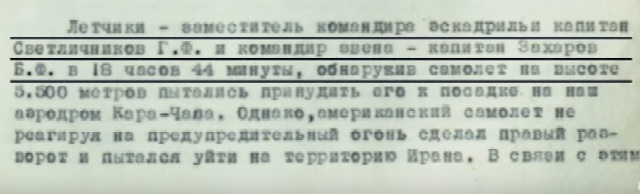 Eskadrilya komandiri kapitan Svetliçnikov və həlqə komandiri Zaxarov 18:44-də 5500 metr yüksəklikdə pozucu-təyyarəni aşkar etmiş və onu bizim Qara-Çala hava limanında yerə enməyə məcbur eləməyə çalışmışdır. Ancaq Amerika təyyarəsi xəbərdarlıq siqnalına məhəl qoymadan sağa tərəf istiqamət götürərək İran ərazisinə keçməyə cəhd göstərmişdir. Bundan sonra 18:58-də qırıcıların atəşləri ilə yandırılmış və hündürlüyü itirməyə başlamışdır. Saat 19-da sərhəd pozucusu olan təyyarədən 5 paraşütçü yerə tullanmışdır.