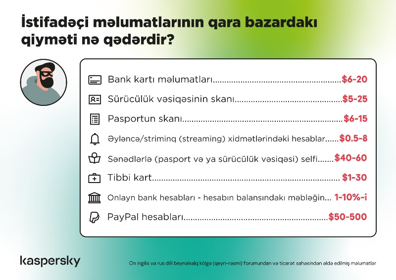 Lent.az xəbər verir ki, "Kaspersky" laboratoriyası on ingilis və rus dilli beynəlxalq kölgə (qeyri-rəsmi) forumunu* təhlil edib və bu gün qara bazarda istifadəçi məlumatlarına hansı qiymətlərin qoyulduğunu öyrənib. Qiymətlərin olduqca yüksək olduğu ortaya çıxıb. Pasport və ya sürücülük vəsiqəsi kimi (sənəd başına 40-60 ABŞ dolları) sənədlərlə selfi, tibbi sənədlər (tam xəstə kartı üçün 30 ABŞ dolları), bank kartı məlumatları (20 ABŞ dollarına qədər), PayPal hesabı (500 ABŞ dollarına qədər), həmçinin Netflix, Twitch kimi əyləncə və ya striminq (streaming) xidmətlərindəki hesablara (hesab başına 8 ABŞ dollarına qədər) xüsusi tələbat var.