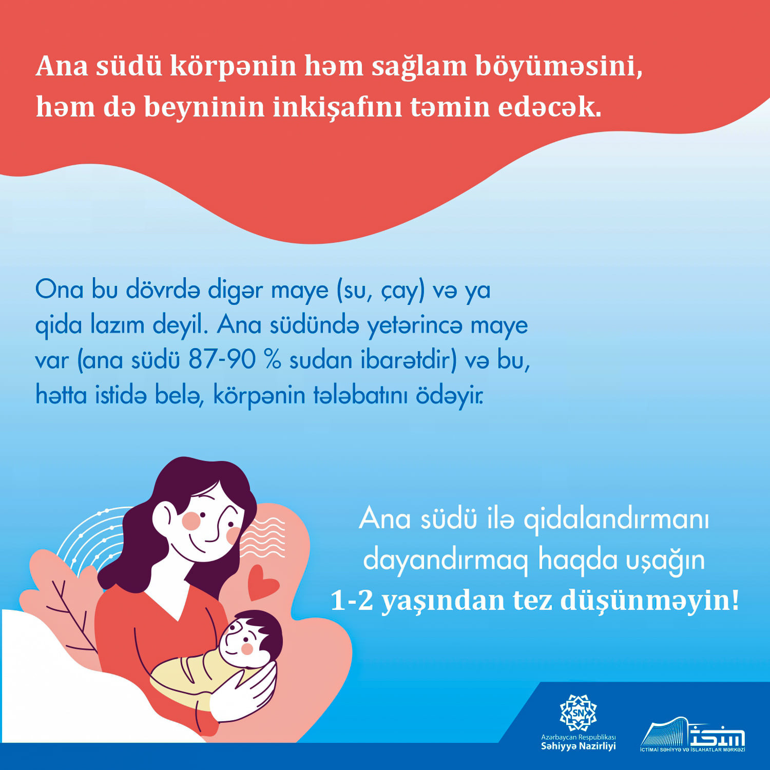 Lent.az məlumat verir ki, bu barədə Səhiyyə Nazirliyinin sosial şəbəkə hesabında paylaşım edilib. Bildirilib ki, Ümumdünya Səhiyyə Təşkilatı (ÜST) körpələrə ilk altı ay ərzində yalnız ana südü ilə qidalanmağı tövsiyə edir: