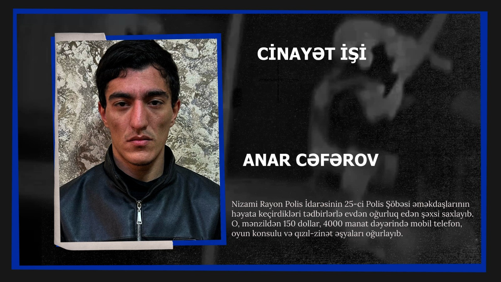 Nizami rayon Polis İdarəsi 25-ci Polis Şöbəsi əməkdaşlarının keçirdikləri tədbirlərlə əməli törətməkdə şübhəli bilinən, əvvəllər oğurluqla əlaqəli cinayətlərə görə məhkum olunmuş 21 yaşlı Anar Cəfərov müəyyən olunaraq saxlanılıb.