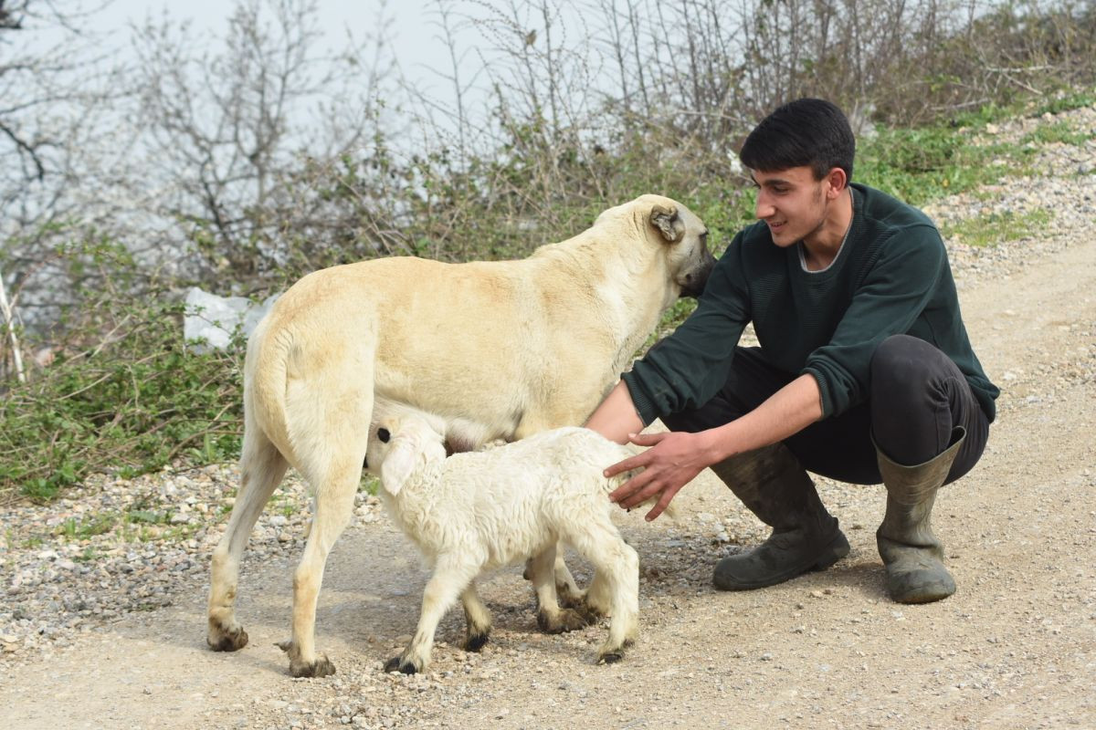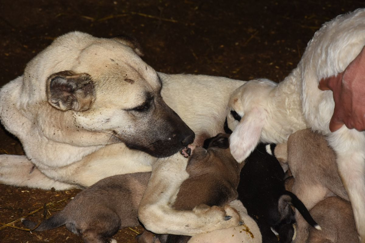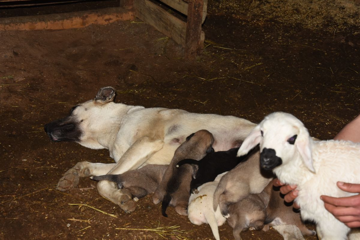 Yeni doğuş edən çoban iti 7 balası ilə yanaşı, Kezban adlı quzuya da analıq edir.