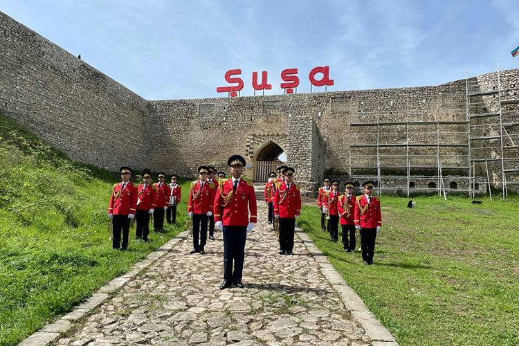 Hərbi orkestr müharibə illərinin mahnı və hərbi marşlarını ifa edib.
