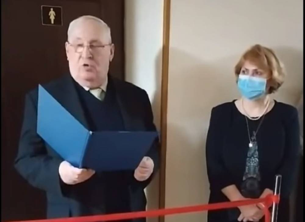 Videoda, yeni tualetin qapısı fonunda danışan universitet rəhbərliyinin nümayəndəsi görünür. O, şeir söyləyir və təntənəli şəkildə qırmızı lenti kəsir.